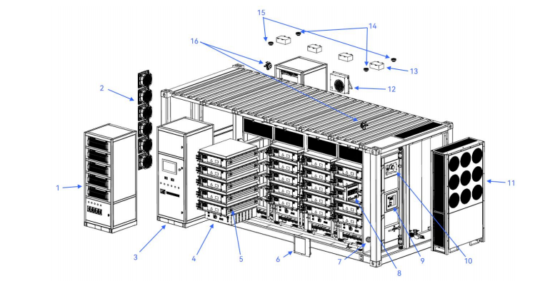 >9 convertitori di potenza bidirezionali modulari (PCS). Il container include 2 armadi PCS, con un totale di 9 PCS da 125 kW. Ogni PCS è collegato a un gruppo di batterie e controlla la carica e la scarica di tale gruppo.