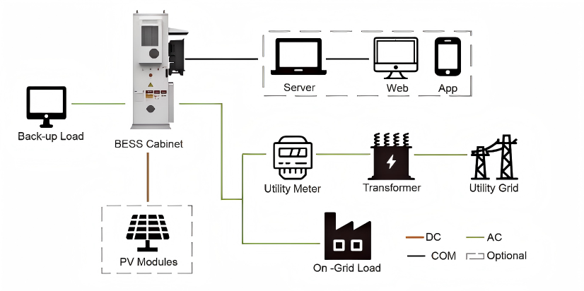 This 50kWh Battery Energy Storage System (BESS) cabinet serves as an energy hub, connecting all key components of the solar power system: